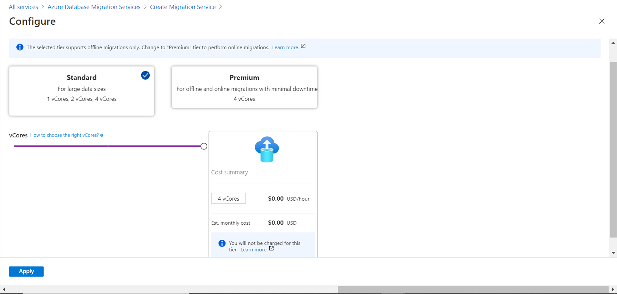 The next important configuration to keep in view is the pricing tier. The default selection is 1 vcore. If we click on the Configure tier, it will show the options as shown below. The standard tier is free of cost, while the premium tier is free of cost for six months. Select the right pricing tier and click on the Apply button.