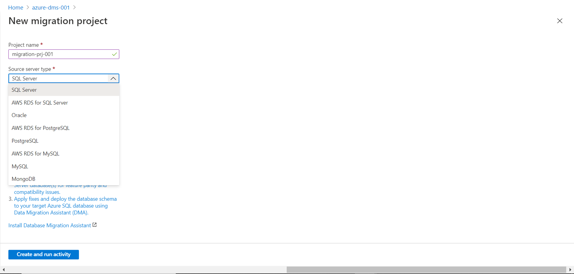 Now that the service is created, we can create a number of migration projects using this service. As we intend to migrate different homogeneous or heterogeneous databases to Azure SQL Database, we will create a new migration project by clicking on the New migration project button. This would pop-up a new wizard as shown below. The first detail to provide in this wizard is the project name. Then we need to select the type of source server from which we intend to migrate data. As shown below, these are the different supported data sources as of the draft of this article. From this list, an example of homogeneous database migration would be SQL Server to SQL Database and heterogeneous database migration would be MongoDB to SQL Database. Select the desired database from the below list.