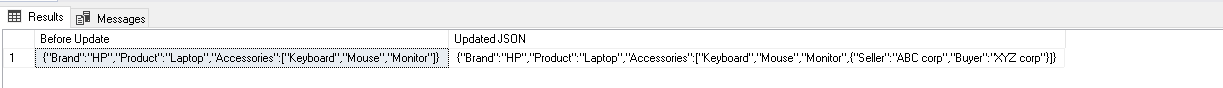 DECLARE @OriginalJSON NVARCHAR(4000), @newjson VARCHAR(100); SET @OriginalJSON = '{"Brand":"HP","Product":"Laptop","Accessories":["Keyboard","Mouse","Monitor"]}'; SET @newjson = '{"Seller":"ABC corp","Buyer":"XYZ corp"}'; SELECT @OriginalJSON AS 'Before Update', JSON_MODIFY(@OriginalJSON, '$.SellerBuyer', @newjson) AS 'Updated JSON'; |