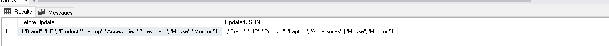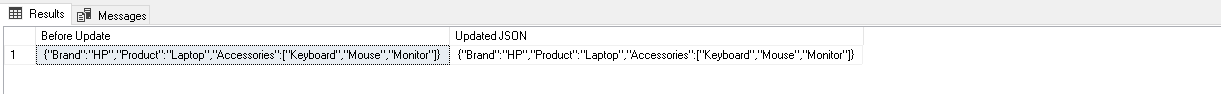 We can update an existing property using the JSON_MODIFY() function as well. For example, suppose someone entered the wrong value in the Accessories array in the zero position. The below code updates the element with a new specified value.