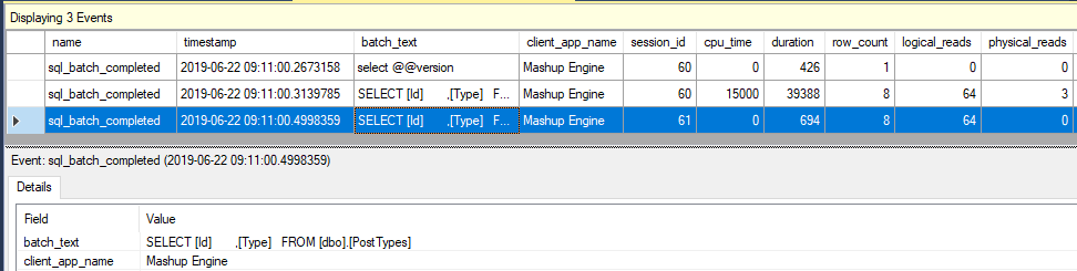 Figure 12: SQL:BatchCompleted SQL Server Extended events