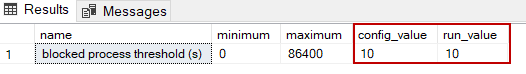 EXEC sp_configure 'show advanced options', 1; GO RECONFIGURE; GO EXEC sp_configure 'blocked process threshold', 10; GO RECONFIGURE; GO EXEC sp_configure 'blocked process threshold' |
