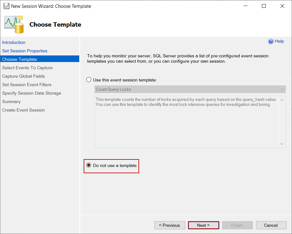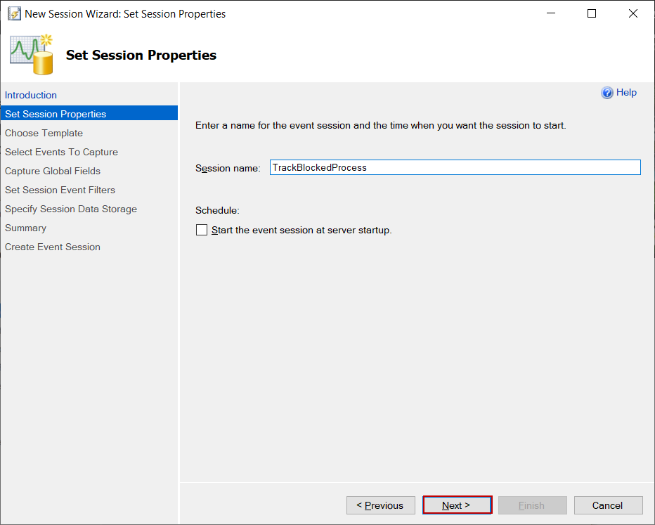 After enabling the blocked process threshold option, we need to create an extended event session that reports the blocked process. To do this we need to use the blocked_process_session event. Firstly, we right-click on the Sessions folder that is located under the Management node and then click New Session Wizard.