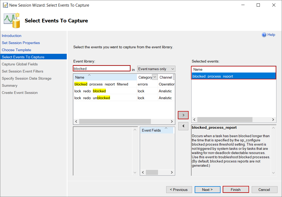 We filter the blocked_process_report event and add it to the Selected events. To quickly create the extended event session, we will click the Finish button. We can see a captured event on the Watch Live Data screen when we simulate a blocked process.