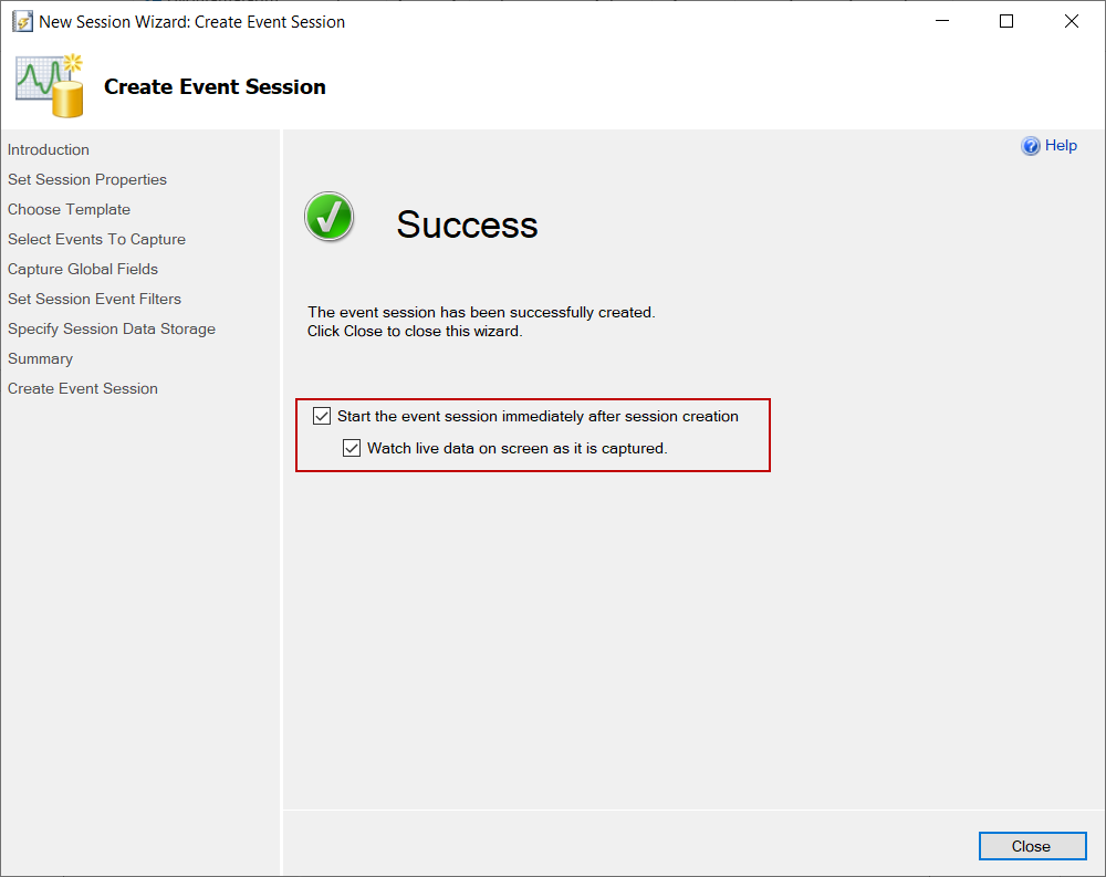 On the last screen of the extended event, we click the Start the event session immediately and Watch live data on screen as it is captured. So that, the session starts immediately and the Watch Live Data screen will appear.