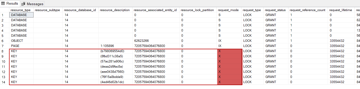 After executing this query, we can check the locked resources in the Adventureworks database with help of the following query. This query includes sys.dm_tran_locks dynamic management view and this view returns information about the currently active lock manager resources in SQL Server.