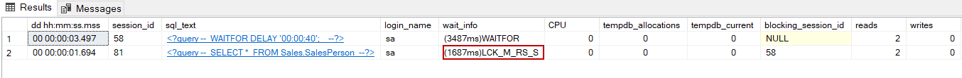 BEGIN TRAN UPDATE Sales.SalesPerson SET ModifiedDate =GETDATE() WHERE BusinessEntityID BETWEEN 274 AND 280 WAITFOR DELAY '00:00:40' ROLLBACK TRAN |