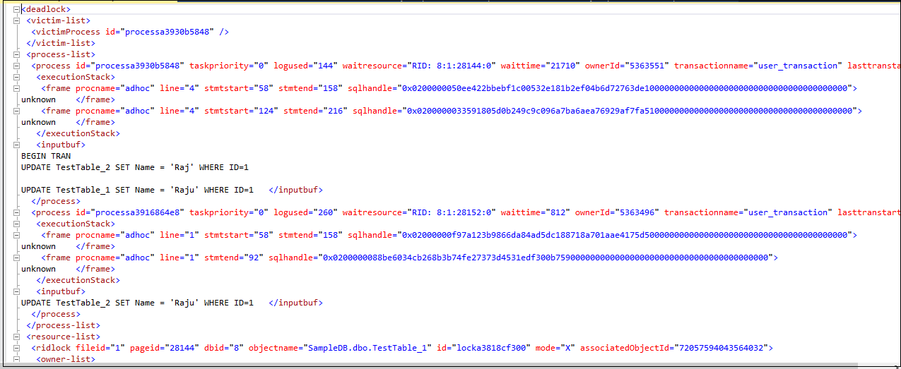 XML Deadlock Report: You can double click on the XML report value, and it opens the complete XML report in the new query window. It gives you complete information about the transactions, locks, deadlock victim and statements