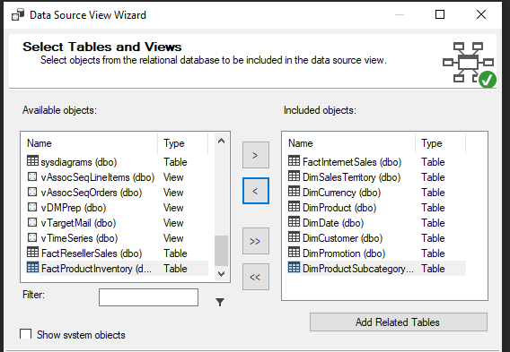 Now new data is updated and it is ready for the newly added language. Let’s see how these columns are used to enhance Multi Language support for SSAS. As previously discussed in an article, OLAP Cubes in SQL Server, let us create SSAS OLAP Cube and we will select the following tables from the adventureworksdw database.