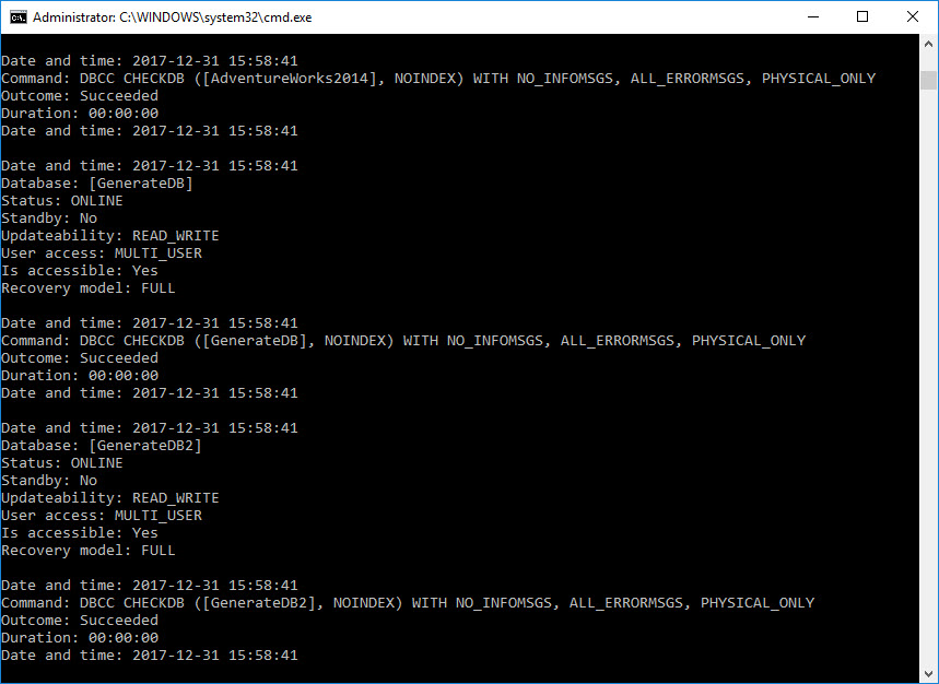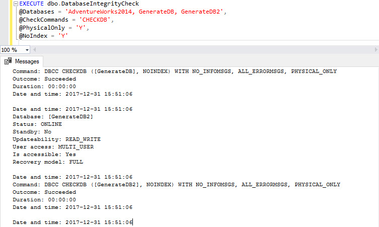 sqlcmd -S DOMENATOR\MAIN -E -d master -Q “EXECUTE dbo.DatabaseIntegrityCheck @Databases = ‘AdventureWorks2014, GenerateDB, GenerateDB2’, @CheckCommands = ‘CHECKDB’, @PhysicalOnly = ‘Y’, @NoIndex = ‘Y'” -b