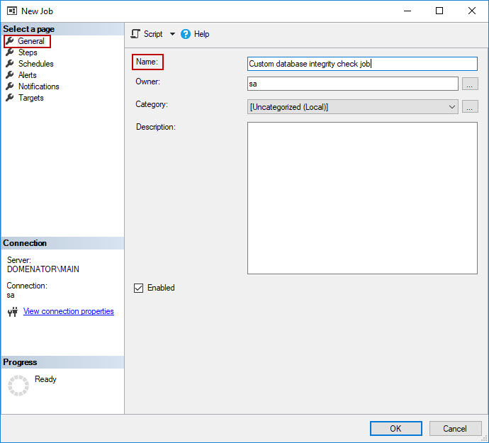 In General tab of the New Job form, provide the name for the job. Optionally, set owner, category, and description.