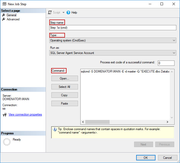 In the New Job Step form provide the name of the job step. Depending on the script that is used, choose one of the available options: