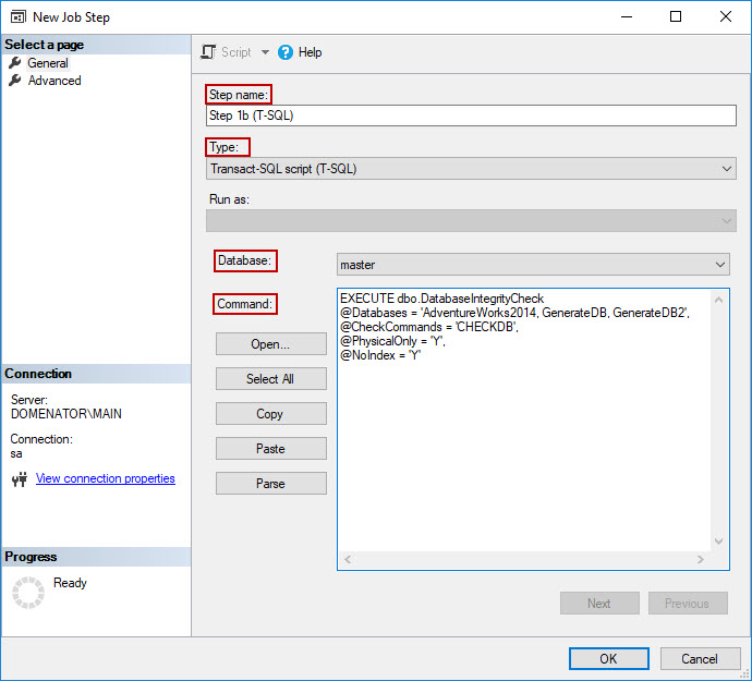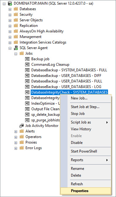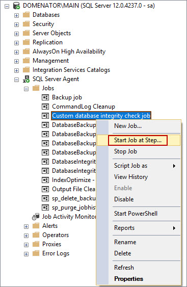 It is possible to use these pre-made jobs on any server, but the full power of Ola’s solution lies in its customization options. The stored procedure dbo.DatabaseIntegrityCheck accepts the total of 15 parameters, which can be provided through SQL Server Agent CmdExec script. The script can then be used to create a custom, fully automated SQL Server Agent job.