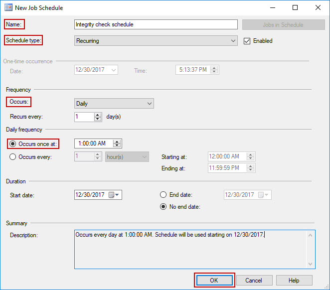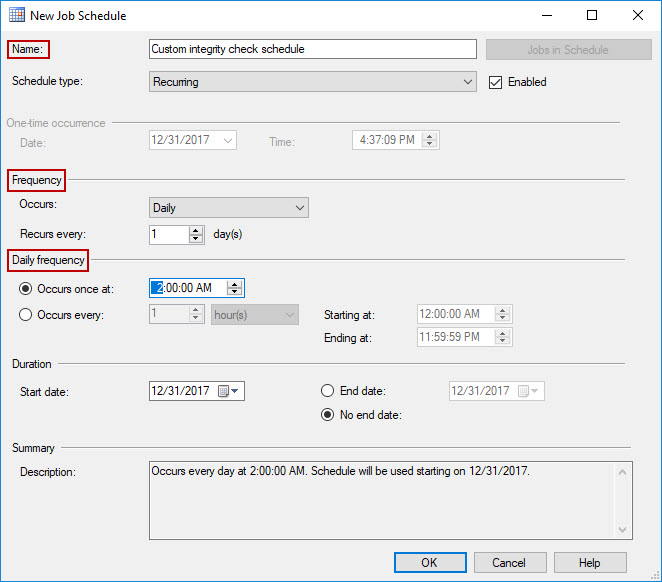 As the integrity check is usually performed daily, the schedule in this example will be set accordingly: