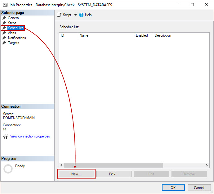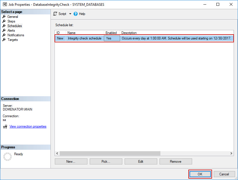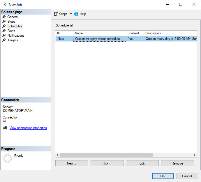 As all other jobs used in Ola’s Maintenance Solution, integrity check jobs also come without the configured schedules. These jobs can be used as such to run the integrity checks manually, but they do need the configured schedule if the solution needs to be automated. Running the integrity check on a large database might take the significant amount of time, so it’s best to schedule these jobs for a time window when low server traffic is expected. A common practice is to run the integrity check jobs daily, during the server maintenance hours.