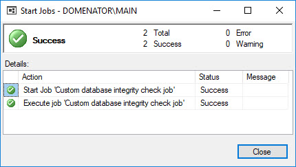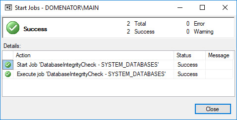 When used with the default settings, the database integrity check jobs runs the DBCC CHECKDB command against system or user databases. The integrity check is often performed to ensure that there are no traces of corruption on a database. If the check fails, it is strongly advised to determine and remove the source of corruption to prevent the potential data loss.
