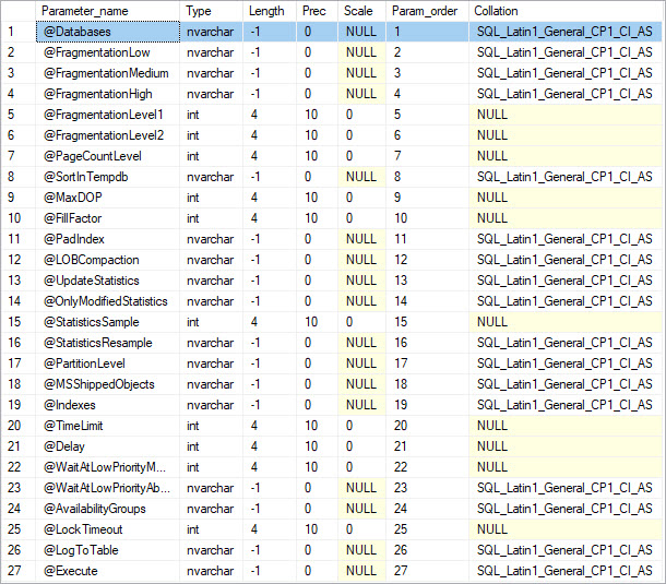 To fully understand the agent job created by the installation script, we need to go through the parameters that IndexOptimize stored procedure uses. The are total of 27 parameters that can be used to configure the procedure. To get full details on the procedure parameters, run a following query: