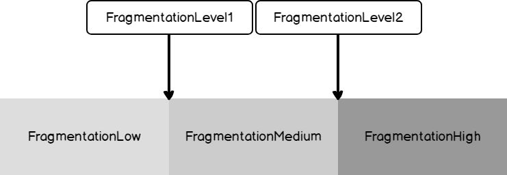 Likewise, the FragmentationLevel2 parameter presents the maximal percentage limit for the indexes with medium fragmentation group, and starting point for the indexes with high fragmentation.