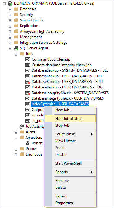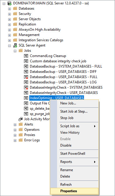 In Object Explorer, expand the nodes: SQL Server Agent\Jobs. Right click on IndexOptimize – USER_DATABASES job, and select Properties.