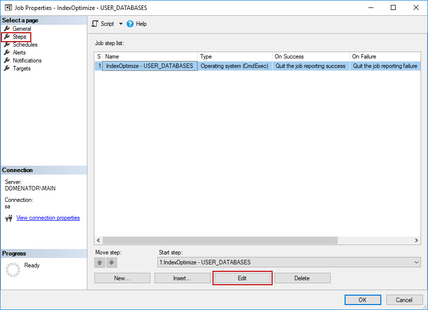 In the Job properties form, navigate to the Steps tab, select the first job step, and click on Edit.