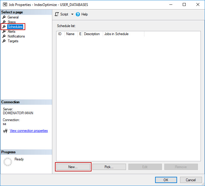 Select the IndexOptimize – USER_DATABASES job, and check its Properties. Navigate to Schedules tab, and click New… button