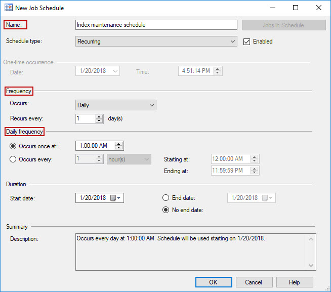 In the New Job Schedule form, provide name and frequency for the schedule. Since offline rebuild tasks take the tables offline while processing their indexes, it is best practice to set the schedule to run when there is little to none traffic on the server. Check the desription at the bottom. If it’s good, click OK to create the schedule.