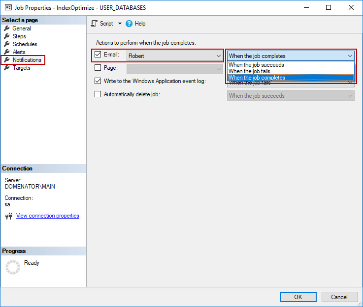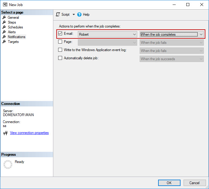 Back in Job properties form, it might be usefull to set Email notiffications for this job. To do this, navigate to Notifications tab, check the E-mail box, and select an operator. If there is no operator set on the server, consult this article that deals with Email notificitaions settings in detail. Finaly, set the condition for sending the email notification. Click OK to save changes.