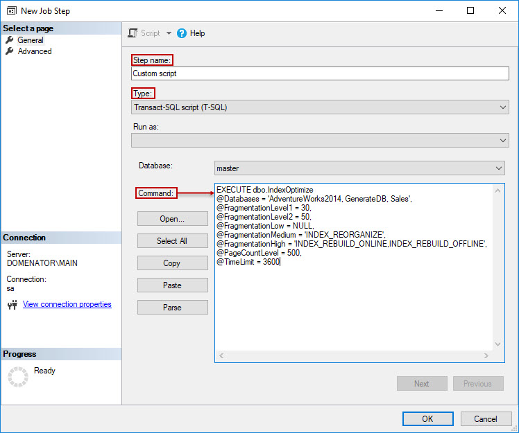 In the New Job Step form, specify the Step name. For the Type, select Transact-SQL script (T-SQL). In Command box, paste the custom maintenance script. Click OK to save the job step.