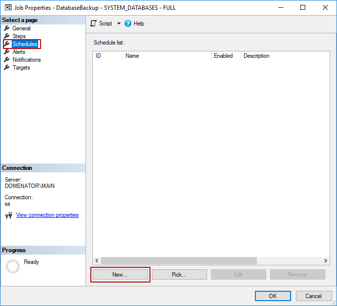 The Job Properties window is opened. Select the Schedules tab, and click on the New button to create a new schedule