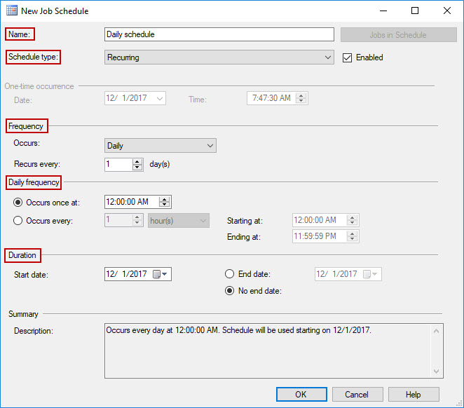 In New Job Schedule window, provide the schedule name, and set the type and frequency for the schedule. As this schedule is used by the job that backs up the system databases, it will be set to run once per day at 12:00 AM. Optionally, set the start and end dates for the schedule. Click OK to save changes