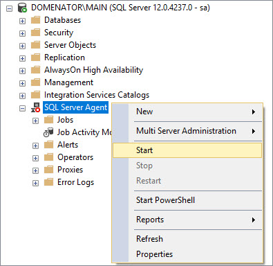 Make sure that the SQL Server agent is installed and running. To start the SQL Server Agent, expand the node of the connected server, right-click on the SQL Server Agent, and click on Start in the context menu