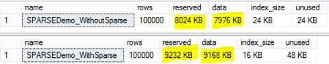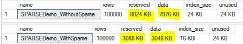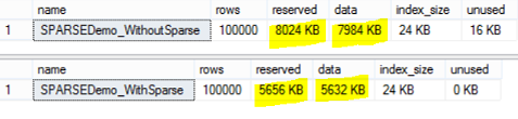 And check the space consumption using the sp_spaceused system object, we will see that the space consumption of the first table without the Sparse Columns will not be affected, and the space consumption of the second one with Sparse Columns changed clearly as follows: