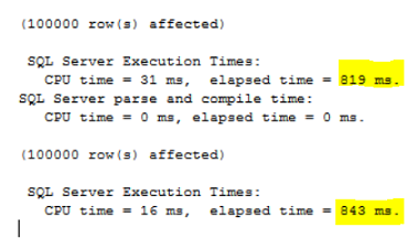 The result will show us that SQL Server scans all records in the clustered index to retrieve the data, performs 759 logical reads, consumes 16 ms from the CPU time and takes 52 ms to finish:
