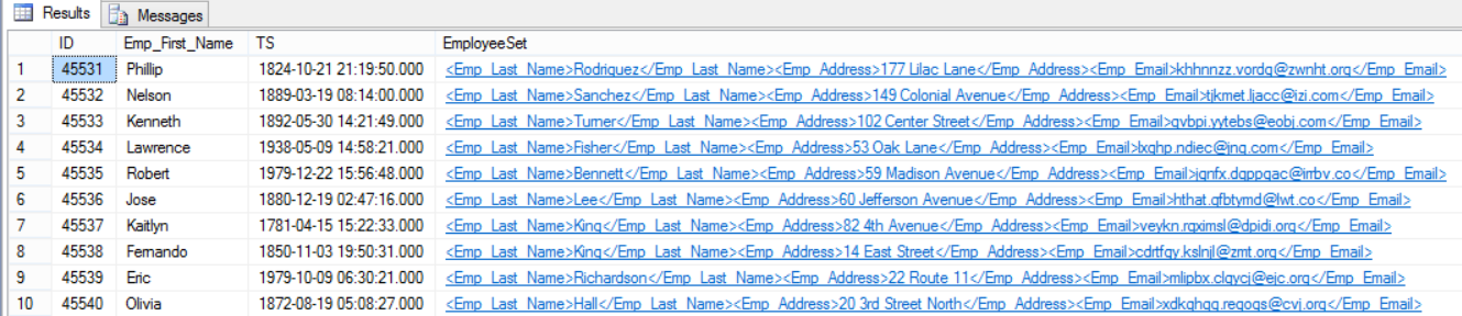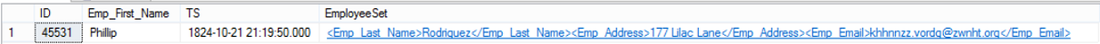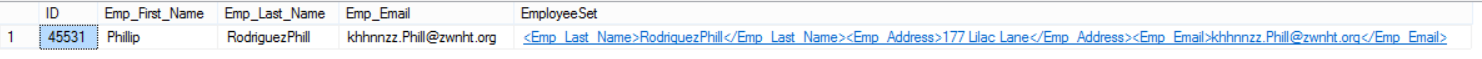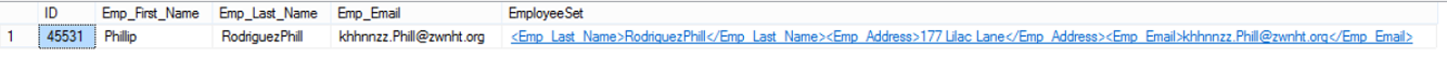 To see how we can take benefits from the Column Set, we will change the Emp_Last_Name and the Emp_Email of an employee with ID 45531 from the ColumnSet XML column in one shot and check if this change will be replicated to the source Sparse Columns. Let’s first check the values before the update: