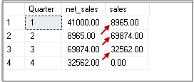 WITH cte_netsales_2018 AS (SELECT [Quarter], SUM(Sales) net_sales FROM dbo.ProductSales WHERE year = 2018 GROUP BY [Quarter]) SELECT [Quarter], net_sales, LEAD(net_sales, 1, 0) OVER( ORDER BY [Quarter]) sales FROM cte_netsales_2018; |