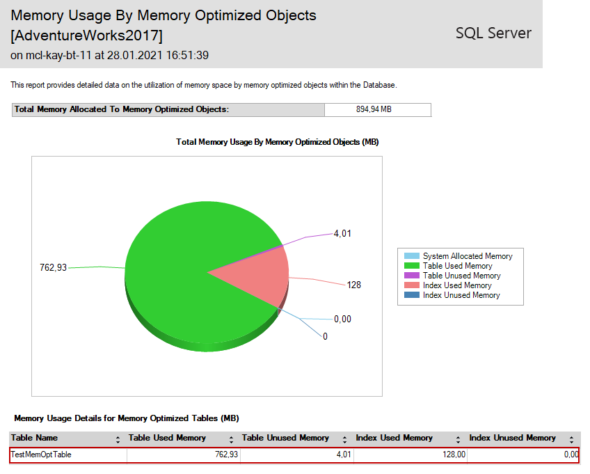 In this report, we can see that TestMemOptTable consumes 762 MB of memory.