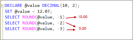 DECLARE @value DECIMAL(10, 2); SET @value = 12.07; SELECT ROUND(@value, -1) SELECT ROUND(@value, -2) SELECT ROUND(@value, -3) |