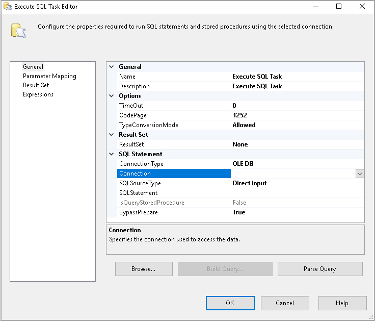 We require configuring the Execute SQL Task. Double-click on this task to open the Execute SQL Task editor.
