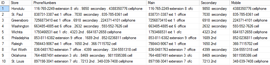 Based on the replaced delimiter values, PARSENAME returns each section of the PhoneNumbers field by its position in the data string. Each of the three types of numbers now has its own field.