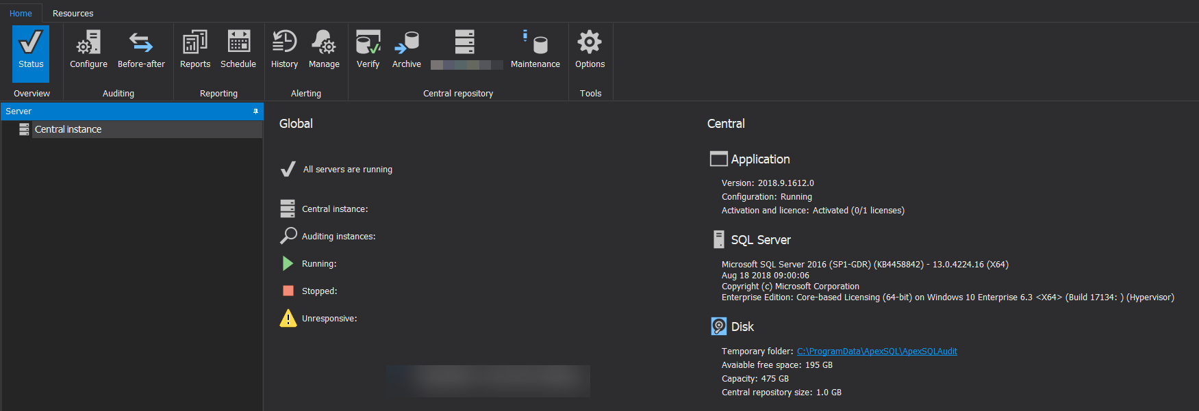 The first window that will be shown when you run ApexSQL Audit is the Status page, that summarizes the general status for the ApexSQL Audit components and the server where these components installed: