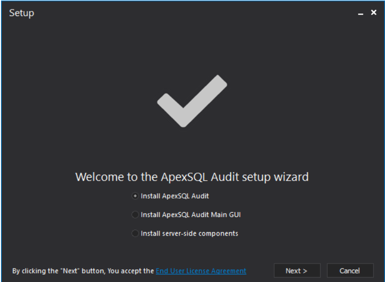 Before installing ApexSQL Audit to your server, you need to download it from the ApexSQL Download Center then run the installation media file on the server with administrator permissions. When the installation wizard initiated, you will be requested to choose from three main options: