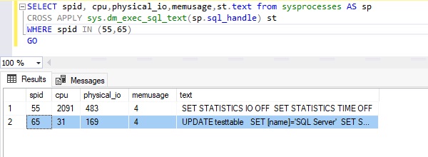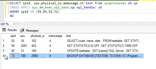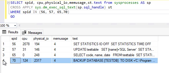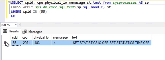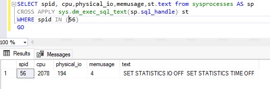 SELECT spid, cpu, physical_io, memusage, st.text FROM sysprocesses AS sp CROSS APPLY sys.dm_exec_sql_text(sp.sql_handle) st WHERE spid IN (56) |