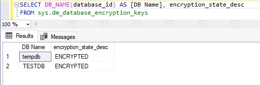 Here is its output which shows user database TESTDB has been ENCRYPTED now. As we know tempdb database also gets encrypted if we enable transparent data encryption for any user database that’s why tempdb is showing as ENCRYPTED in the below image.