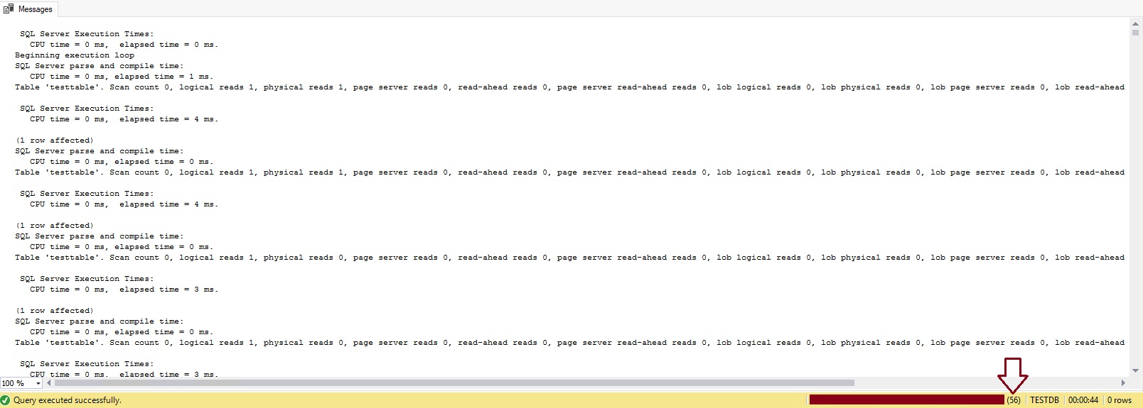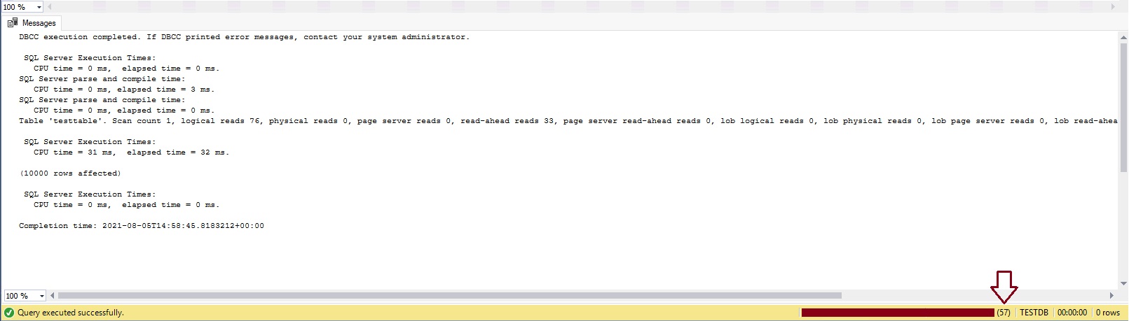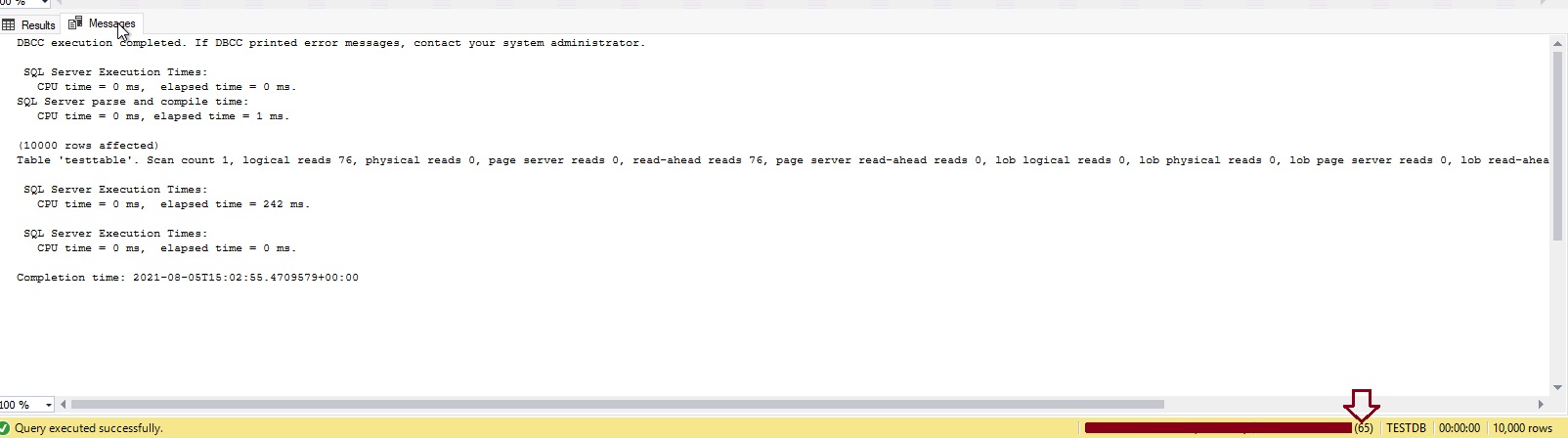 USE Testdb GO SET STATISTICS TIME ON SET STATISTICS IO ON GO INSERT INTO testtable DEFAULT VALUES ; GO 10000 SET STATISTICS IO OFF SET STATISTICS TIME OFF |