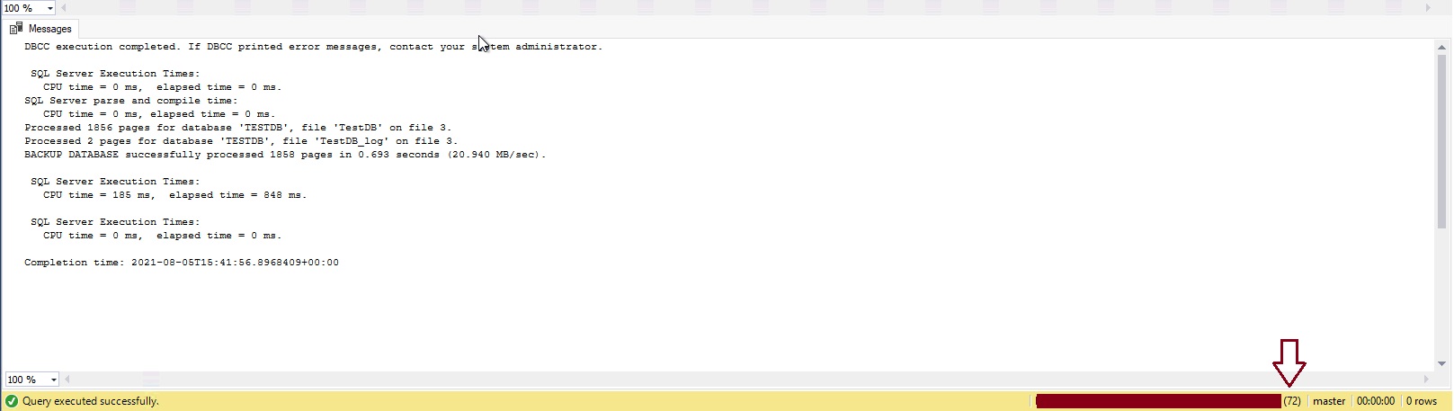 Now, we have enabled TDE on the user database TESTDB. Next, we will repeat the same activities which we have done in the first section of this article to gather performance statistics of each execution of INSERT, UPDATE, SELECT and BACKUP DATABASE. Restart your SQL Server instance to gather performance stats from scratch. Although it’s not mandatory I did it during this analysis.