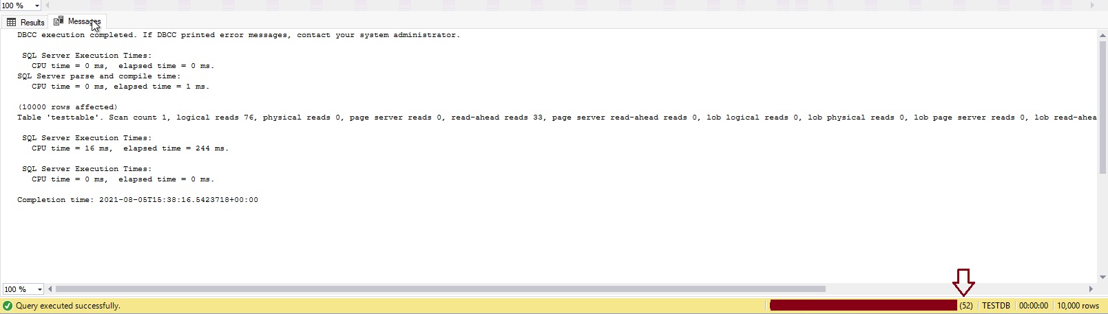Run below INSERT statement to insert 10000 rows in above newly created table testtable. Use SET STATISTICS TIME and SET STATISTICS IO statements to gather their performance stats details.