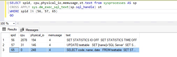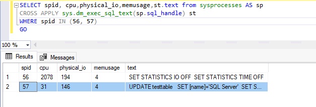 Session id for the above execution is showing as 56 so I have retrieved performance statistics of this session from the sysprocesses system view using the below T-SQL statement.