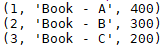 record_1= ["Book - B", 300] record_2= ["Book - C", 200] record_list = [] record_list.append(record_1) record_list.append(record_2) insert_records = '''INSERT INTO Books(Name, Price) VALUES(?,?) ''' cursor.executemany(insert_records, record_list) conn.commit() |