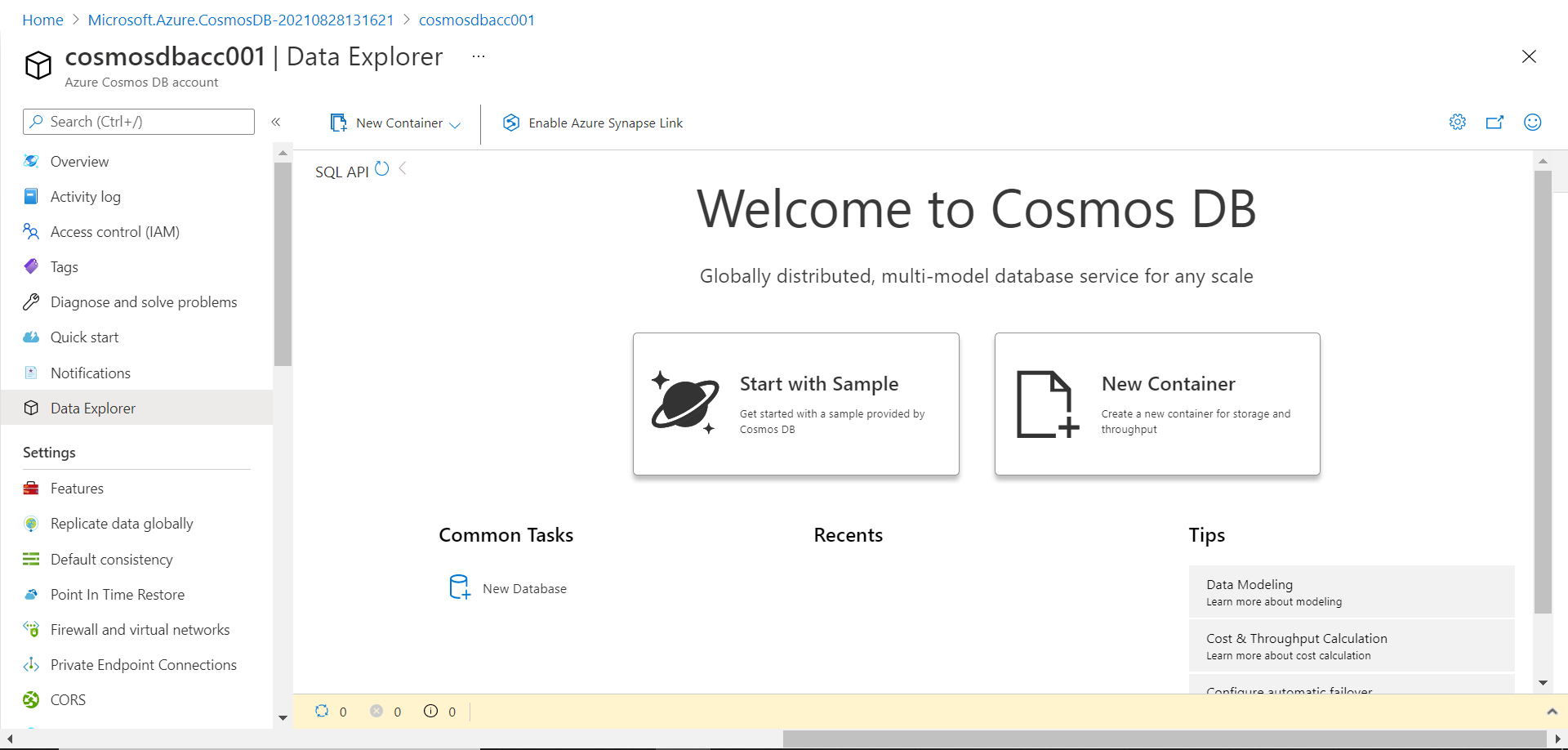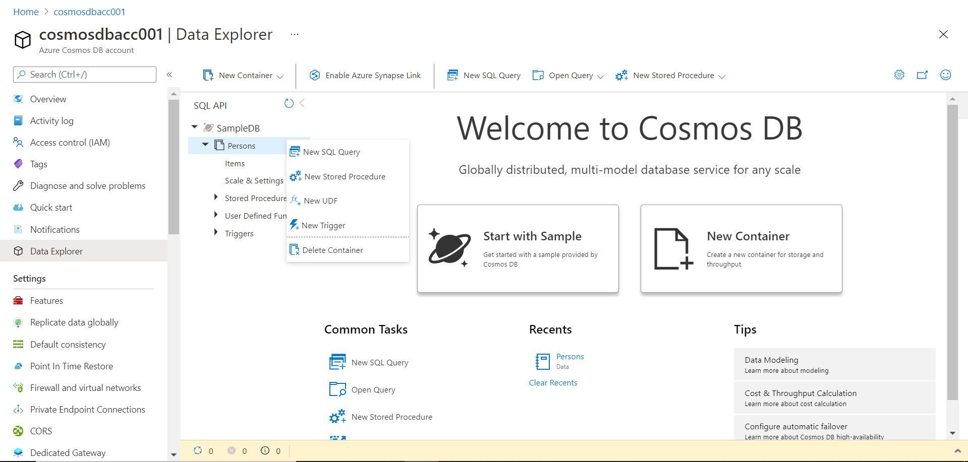 Before we start with the exercise explained below, it is assumed that an Azure account with an instance of Azure Cosmos DB with a continuous backup policy is already in place and one has administrative privileges over this account. Navigate to the account home page, and from the left pane, click on the Data Explorer menu option as shown below. It would open the data exploration page of the account. If you have created a brand-new account, by default, you won’t have any data in it. The data explorer page would provide options to create sample data as well. To perform a point-in-time restore, we would need some data to create some events, so that we can make changes and revert it by performing a point-in-time restore. Let’s create some sample data in this account. Click on Start with Sample option by click on the tile as shown below. This step will result in the creation of a new database as well as a container with sample data in it.