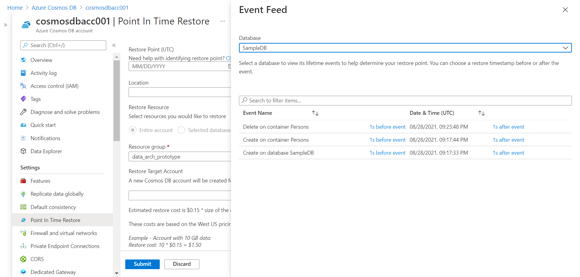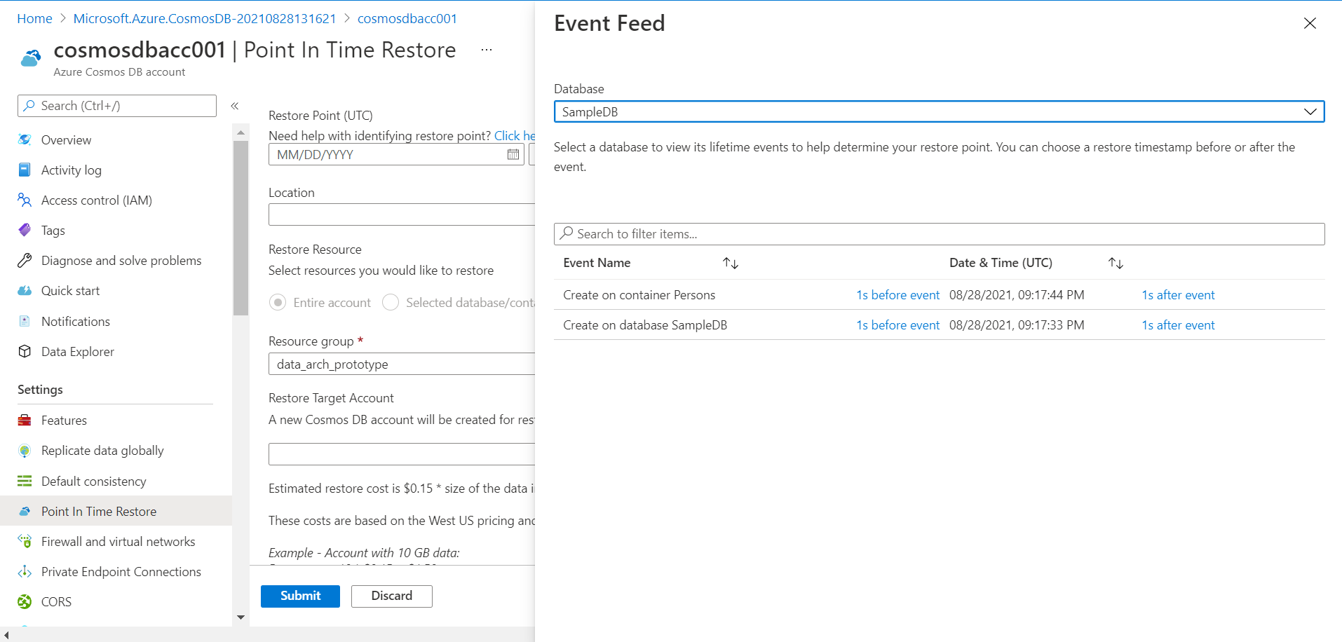 The first step towards performing a point-in-time restore is selecting the restore point. As many operations are performed on different databases and containers in an account, it may get difficult to pinpoint the exact event. We have the option to select the time range when the restore point of interest would have taken place. If we do not know the exact timings, we can click on the link shown on the page to explore the event feed which would list all the available restored points as shown in the pop-up window. In the event feed, we can select the database for which we want the explore the event feed and it would list all the most recent events. We just created a new sample database and a container, so the same is available here. We have the option to select the time before and after the event.